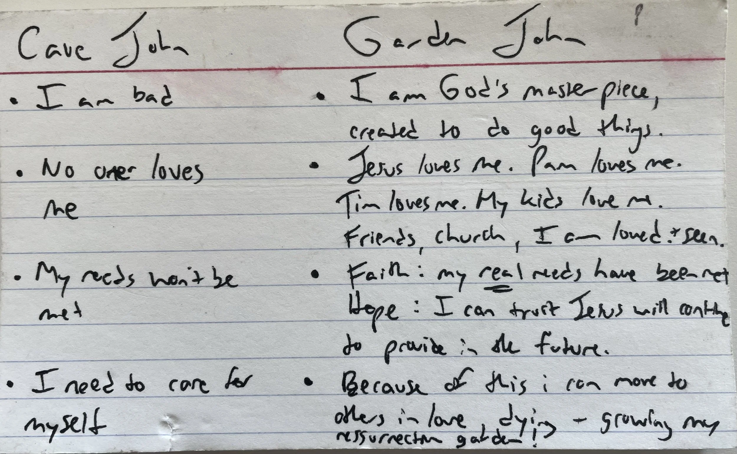 On my climb, I was able to get to a place where I was able to name what Evil was saying and how Jesus was calling to me in response. Every morning, even now, I need this reset. This is a core, daily prayer, for me each morning. To reject how Evil has named me since I was a child, and embracing God’s new Identity for me.
