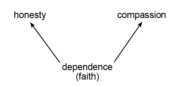 In other words, this isn’t just a throwaway comment from Jesus. This describes Jesus’ whole life. Dependence—that is, faith—shapes and empowers honesty and compassion. The opposite is also true. Self-will twists and distorts our honesty and our compassion.